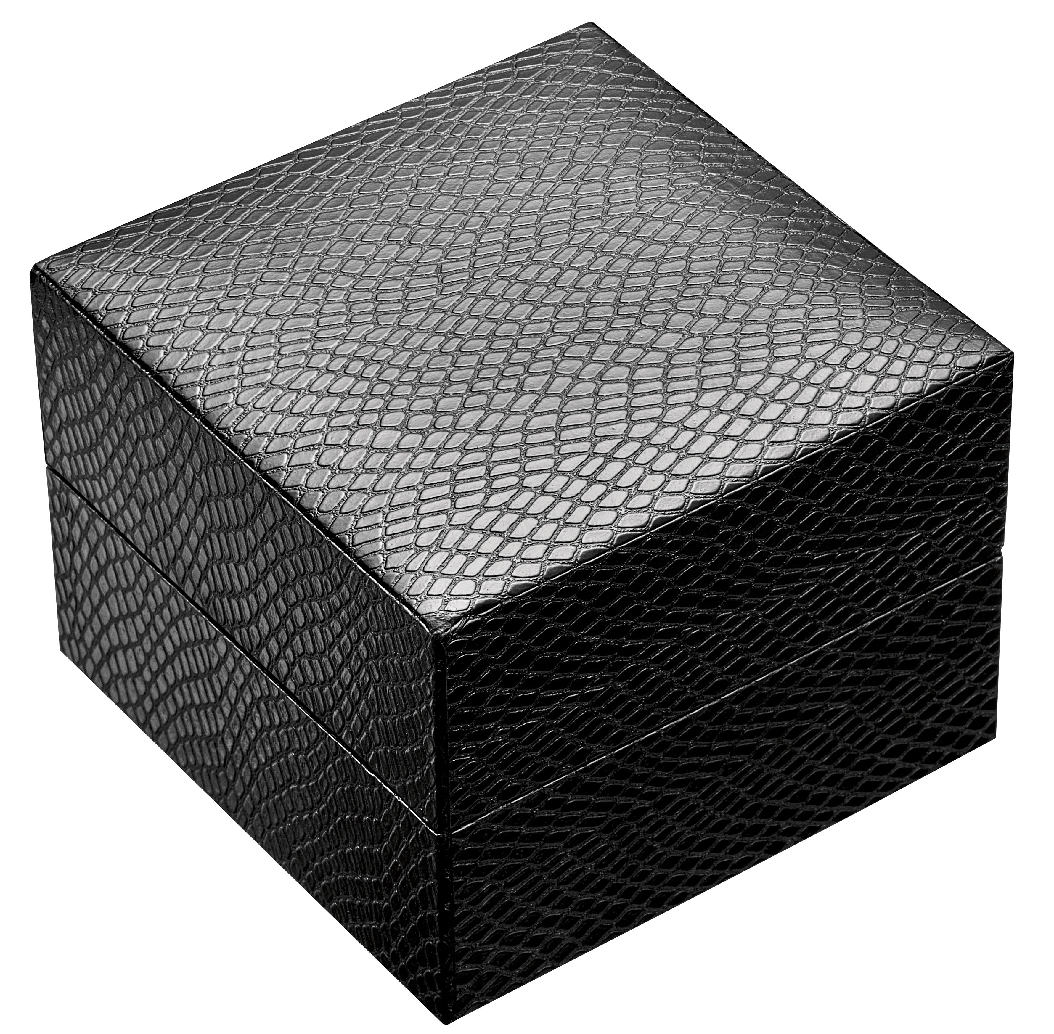 Black Lizard Grain solid plastic watch box with beige interior and pillow.
