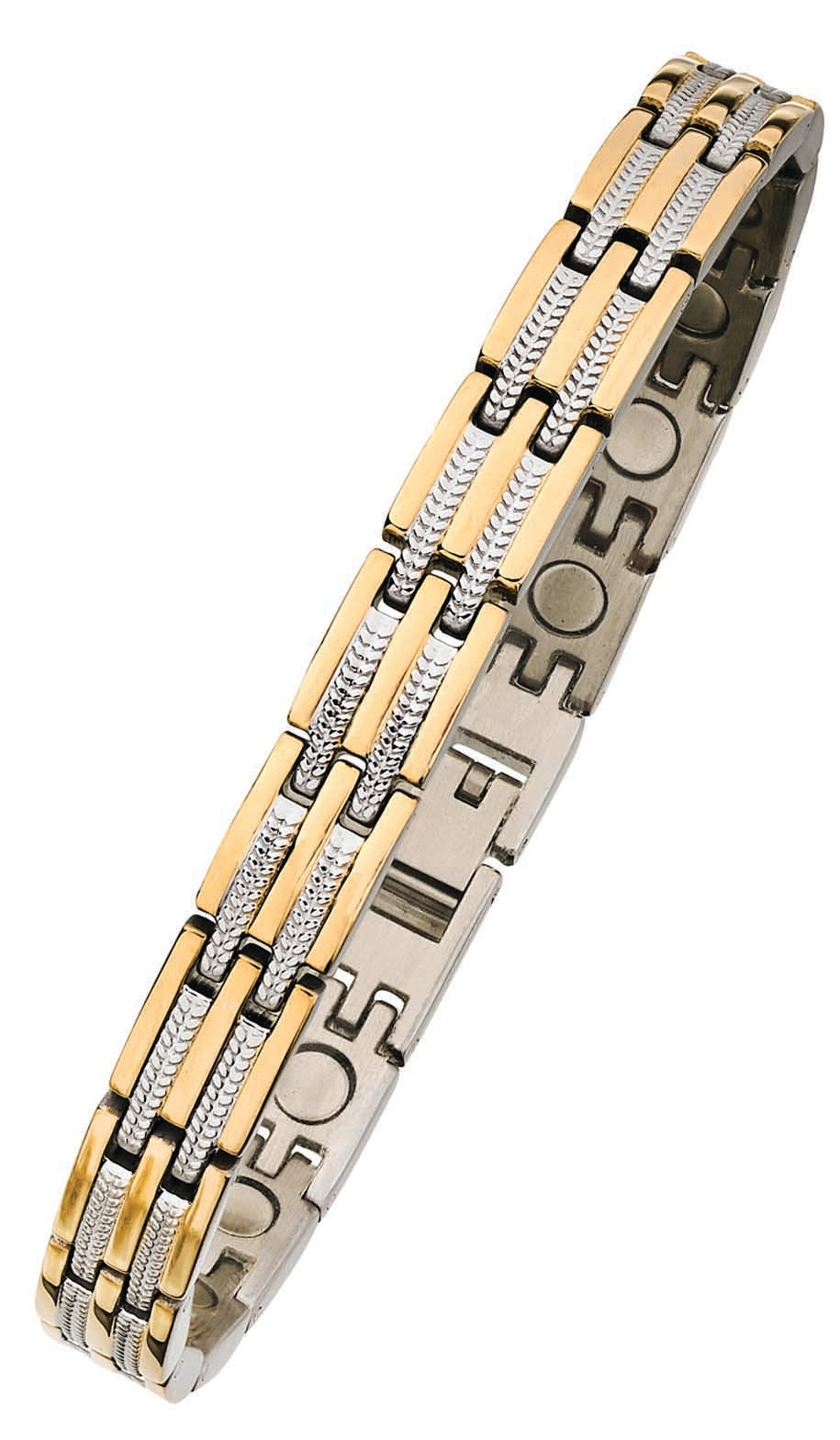 This stainless steel magnetic bracelet is 1/4 inch (8mm) wide. The yellow part in the bracelet is gold plated. All our magnetic bracelets are 7.5 to 8.0 inch long.