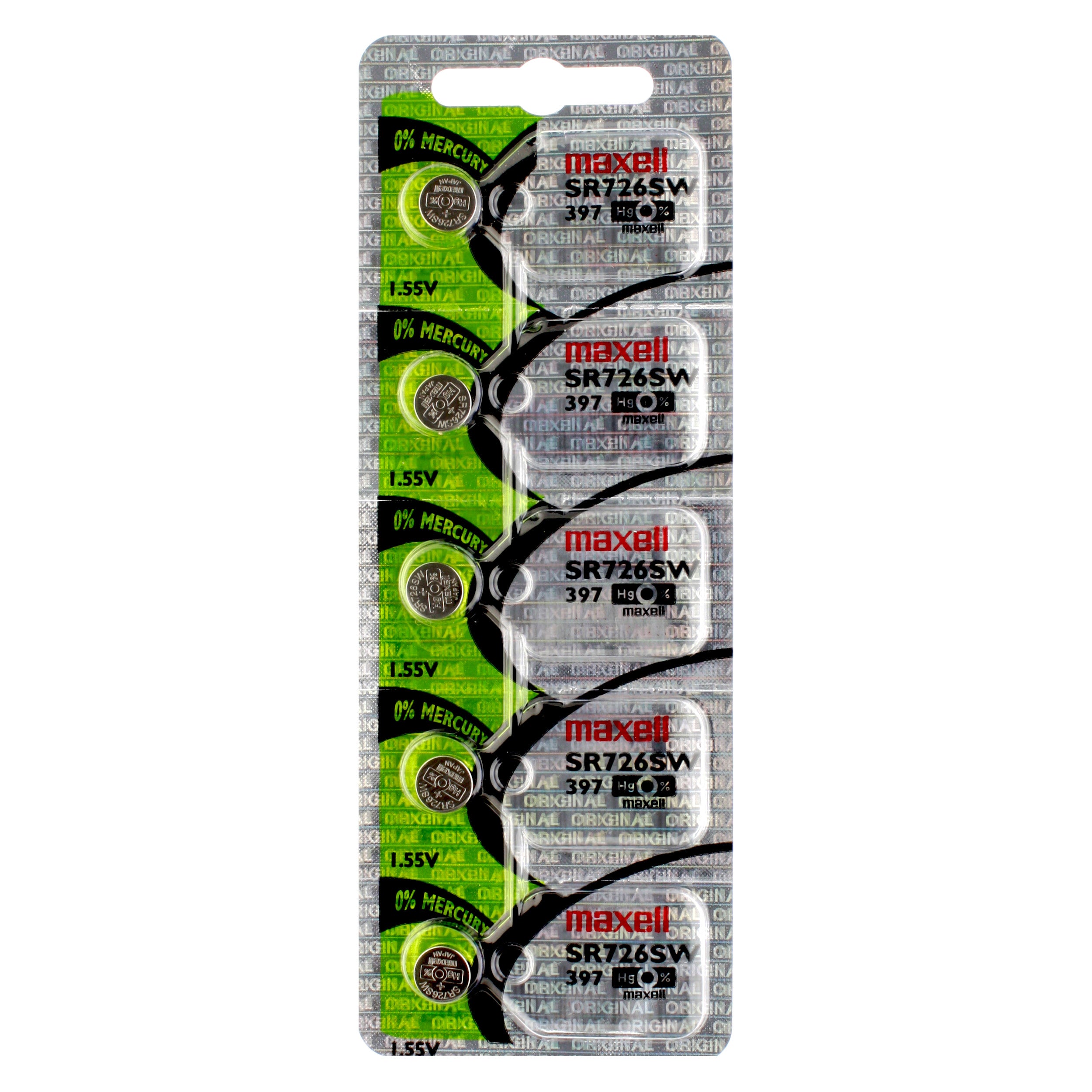 Maxell Watch Battery SR726SW is a silver oxide low drain battery 1.55 V. Watch Battery 397 measures 7.9X2.6mm. It is mercury free and has a capacity of 32 mAh.