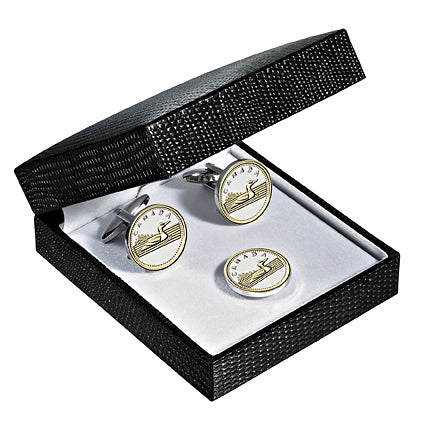This elegant Loonie Cufflink/ Pin Set is more than just a stylish accessory - it's a souvenir and a conversation starter. Made with high-quality materials, this set is perfect for any formal occasion or as a unique gift for the Canada-loving gentleman in your life.