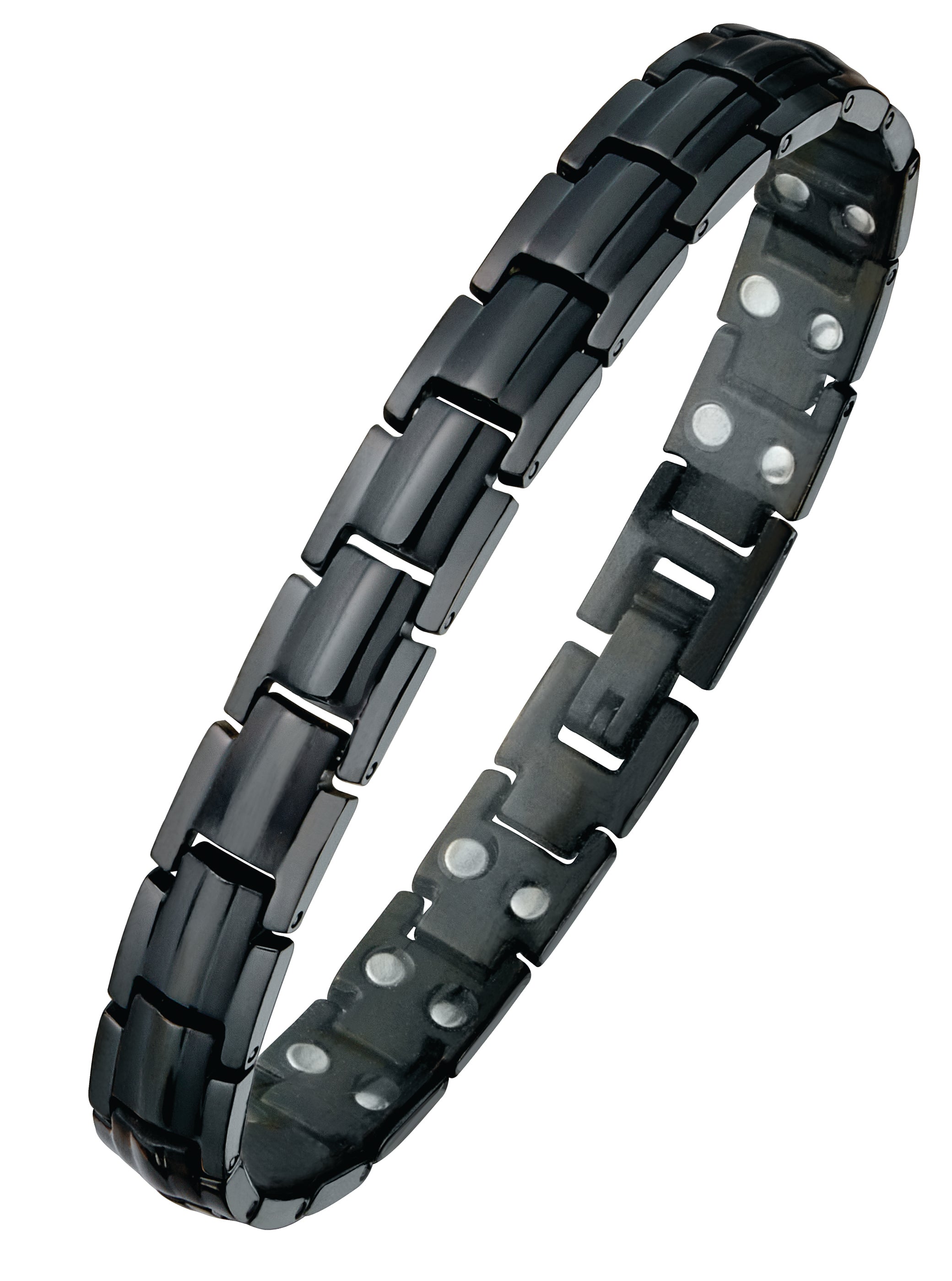 This stainless steel magnetic bracelet is 3/8 inch (9mm) wide. It is PVD plated in black color. All our magnetic bracelets are 8 to 8.5 inch long.